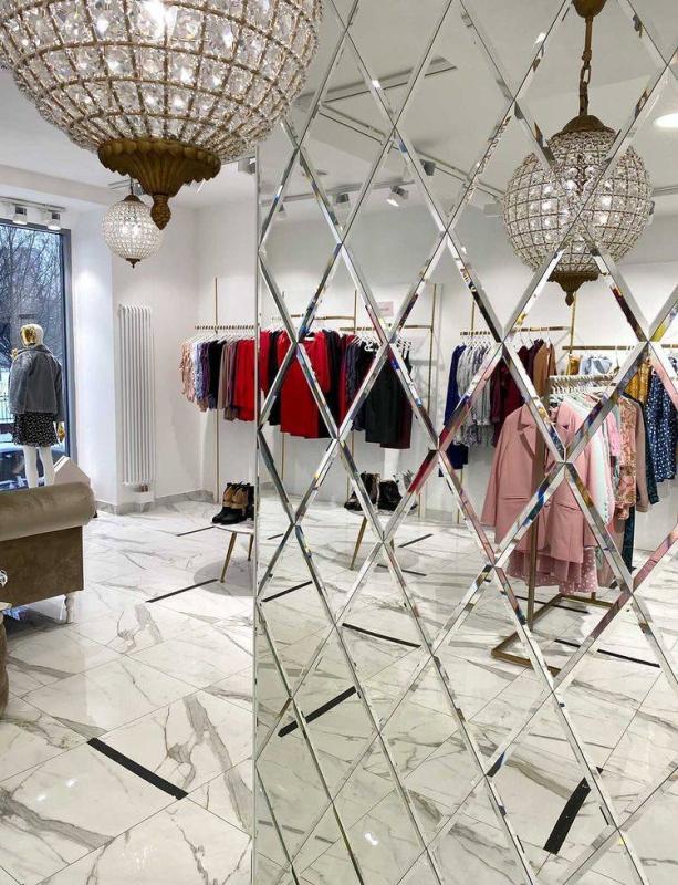 Использовалась серебристая зеркальная плитка формы "вытянутый ромб".